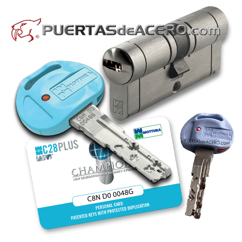 Cilindro C28+ plus champions mottura con 5 llaves de doble embrague con sistema antirotura y 5 llaves incopiables y sistema anti-bumping. llave codificada